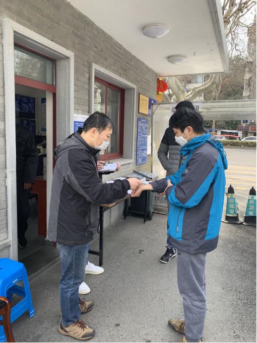 圖:公司員工配合社區人員對進(jìn)出園區人員進(jìn)行測溫登記
