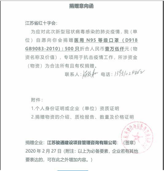 作為第一批國有企業(yè)改制而來(lái)的咨詢(xún)公司,回報社會(huì )一直是駿通人的使命和擔當。公司領(lǐng)導通過(guò)多日多方聯(lián)系籌措了500只醫用N95口罩并全部捐獻給江蘇省紅十字會(huì ),用于前線(xiàn)醫院的使用;