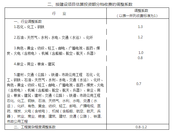 3.根據行業(yè)特點(diǎn)和各行業(yè)內部不同類(lèi)別工程的復雜程序,計算咨詢(xún)費用時(shí)可分別乘以行業(yè)調整系數和工程復雜程度調整系數(見(jiàn)附表二)。